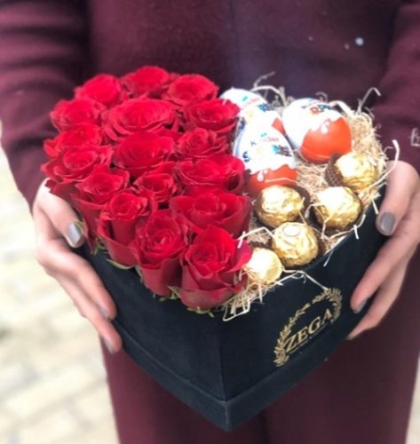 Kalp kutu icerisinde 12 ile 15 arası gül kullanılmaktadır. Yanında ferrero rocher cikolata ve 3 adet süpriz yumurta cikolata kullanılmıstır.
