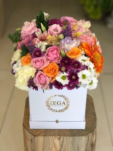 Renkli çiçek kutusunda mevsim çiçekleri ve güller ile hazırlanmıstır. İsteğe göre kutu rengi ve çiçek renkleri değiştirebilir.